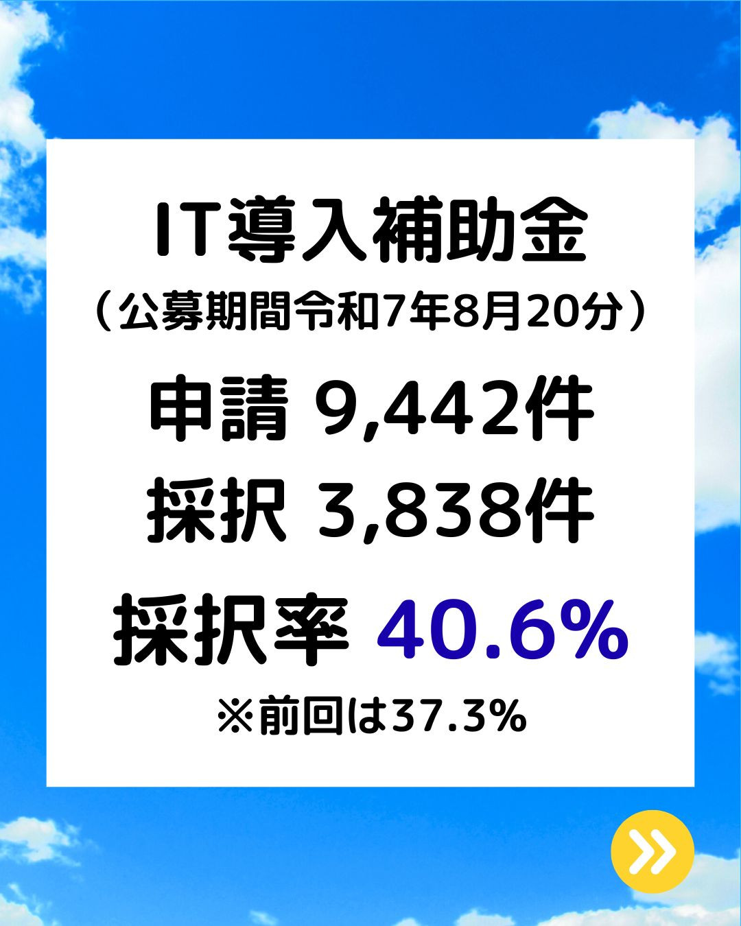 IT導入補助金2025(公募期間令和7年8月20日分)は、応募が9,442件で、採択は3,838件でした。