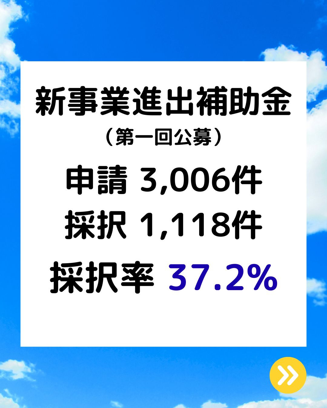 今年新たに開始した、新事業進出補助金(第1回公募)は、応募が3,006件で、採択は1,118件でした。